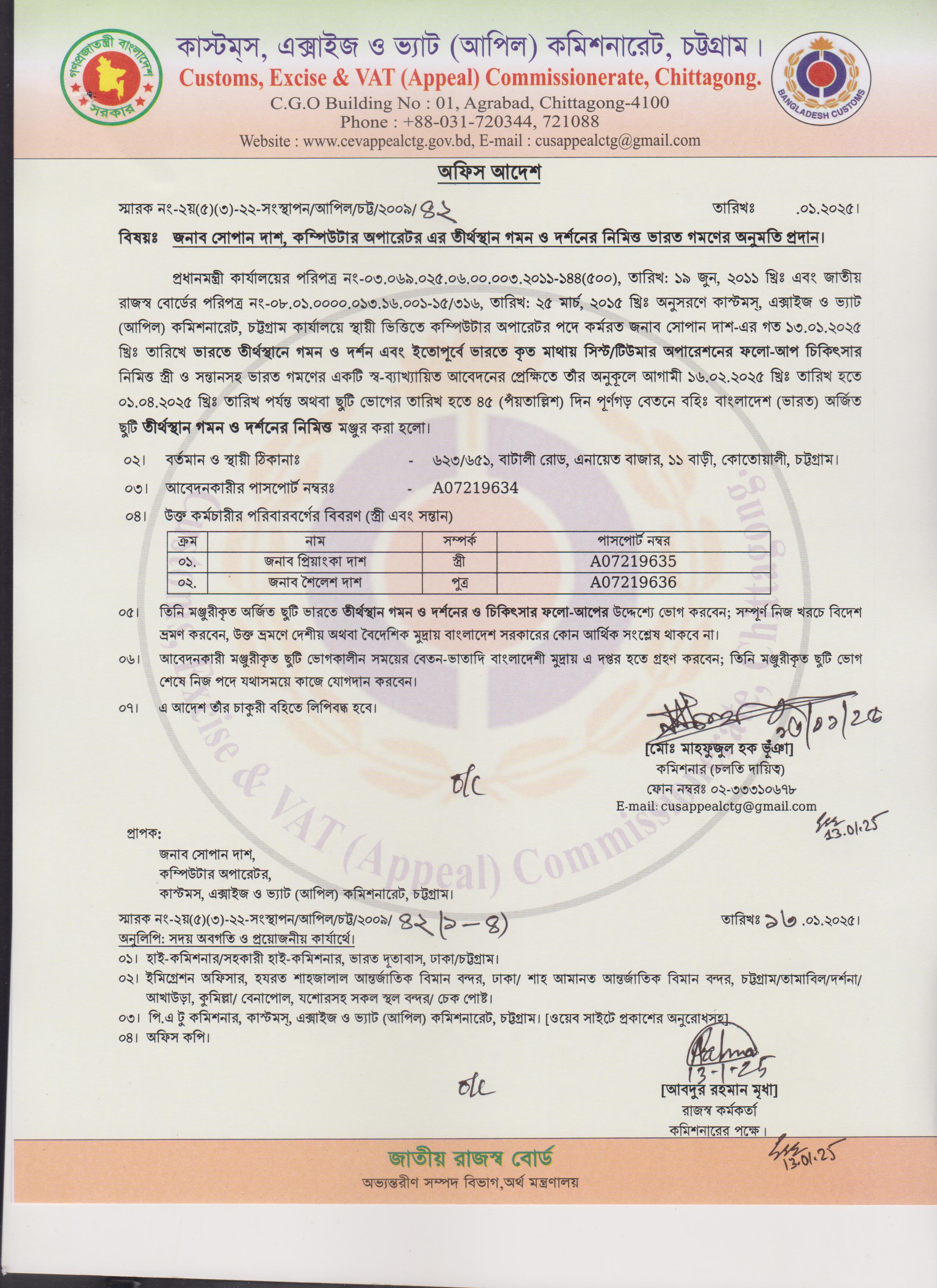 জনাব সোপান দাশ, কম্পিউটার অপারেটর এর তীর্থস্থান গমন ও দর্শনের নিমিত্ত ভারত গমণের অনুমতি প্রদান |